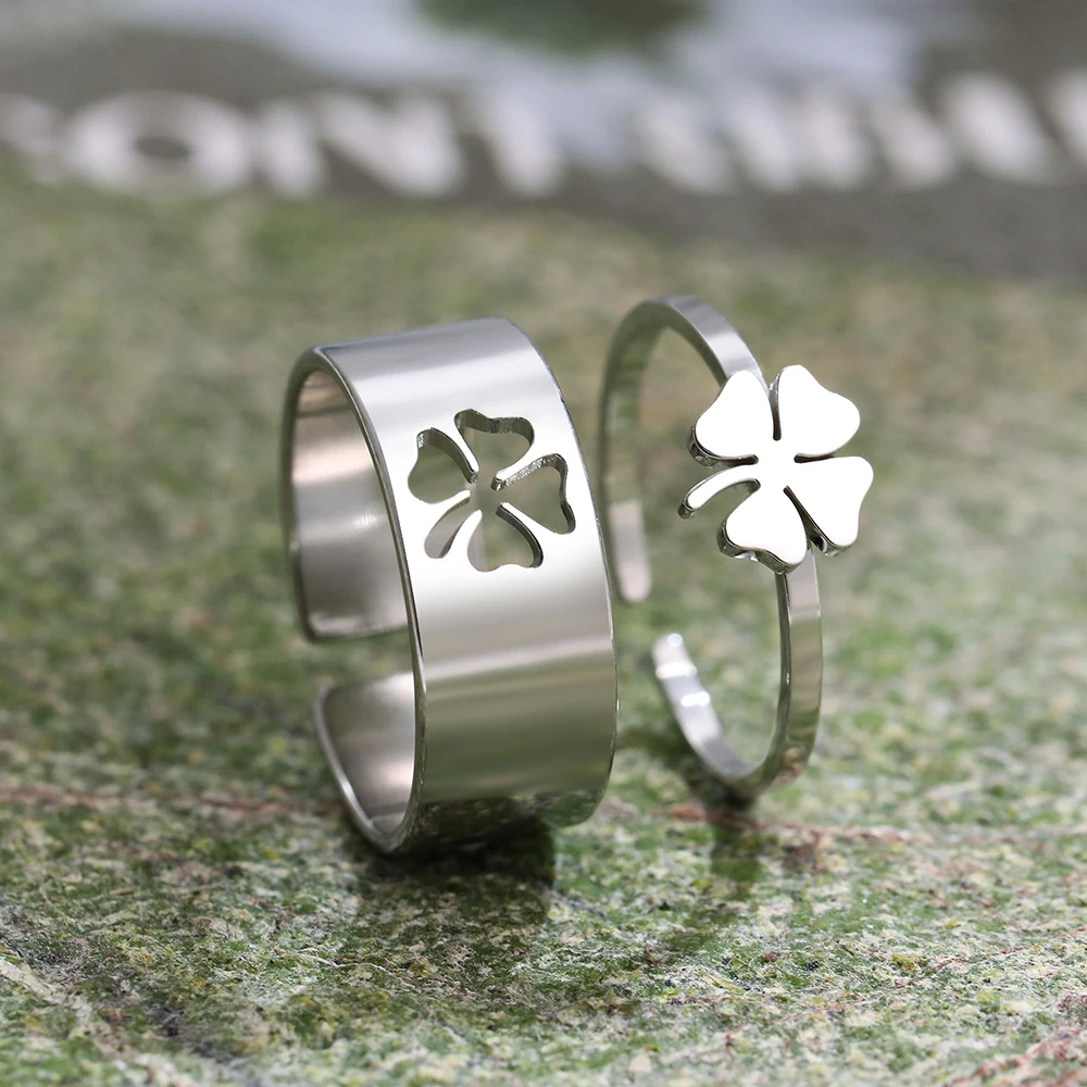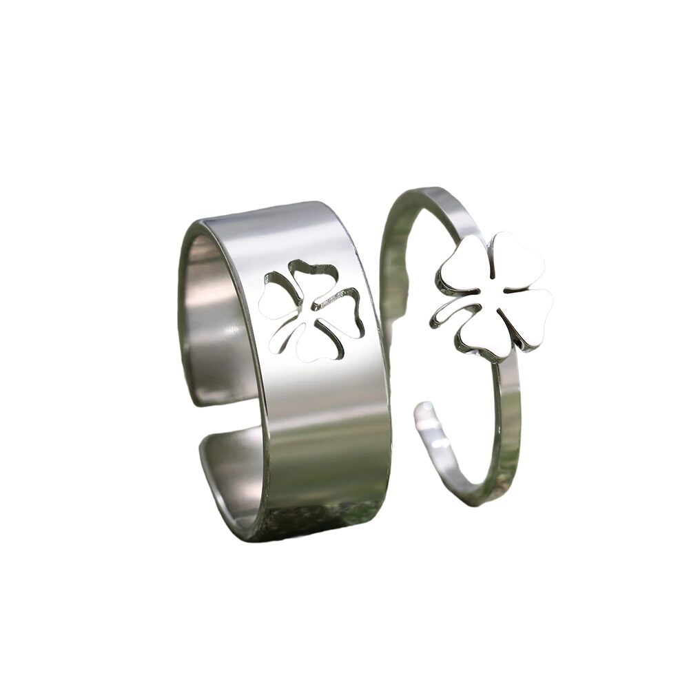 Bagues couple assorties trèfle à 4 feuilles argent acier inoxydable