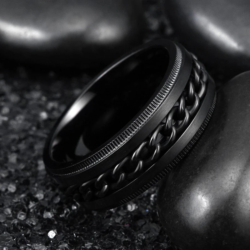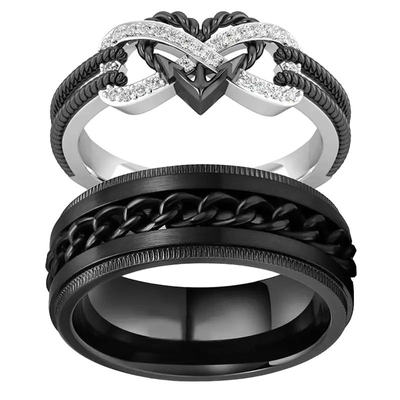 Exprimez votre amour éternel avec ces bagues assorties noires et argentées au design moderne et audacieux. La bague féminine arbore un motif cœur serti de cristaux scintillants, tandis que la bague masculine affiche un look robuste avec une chaîne noire tressée sur un anneau en acier inoxydable. Ces bagues symbolisent l’unité et la force de votre relation, tout en étant stylées et résistantes grâce à leur conception en titane et acier inoxydable.